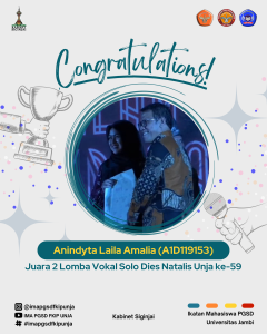 Baru-baru ini, mahasiswa PGSD Unja berhasil meraih prestasi di lomba vokal solo dalam rangka Dies Natalis Unja ke-59. Mahasiswa yang bernama lengkap Anindyta Laila Amalia tersebut telah mengalahkan peserta yang menjadi delegasi dari fakultas-fakultas lain di Universitas Jambi dan menyabet juara 2 di lomba tersebut. Lomba ini dilaksanakan pada tanggal 22 Juli 2022 dan merupakan salah satu tangkai lomba dari beberapa lomba yang diadakan dalam rangka merayakan hari jadi Universitas Jambi ke-59 yang dimana para warga Unja baik itu mahasiswa, pegawai, staff, maupun dosen saling berkompetisi.